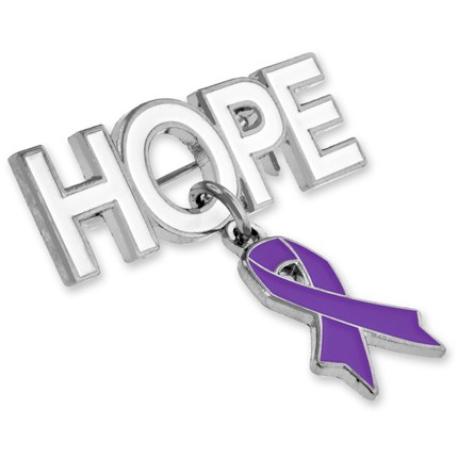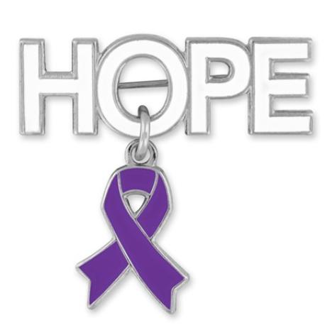 Our HOPE with Purple Ribbon Charm Pin is a must for awareness campaigns and to distribute to family members and friends. The HOPE in this pin measures 1-1/4"W x 7/16"H, is a cut-out design, struck from premium jeweler's metal, white enamel color filled and nickel plated. It features a dangling awareness ribbon from the O, which measures 3/4"H x 1/4"W, is also a cut-out design, Purple enamel color filled and nickel plated. This presentation includes a safety pin back, allowing this brooch style to stay in perfect place on your garment. It comes to you individually poly bagged. This pin is a great symbol to wear on your lanyard, lapel, I.D. badge and purse strap.