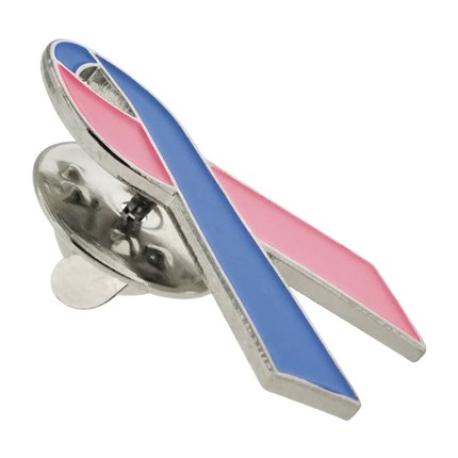 This ribbon pin is most commonly used to raise awareness for loss of a child, miscarriage, ectopic pregnancy, neonatal death, SIDS or stillbirth, and male breast cancer. Our Pink & Blue Awareness Ribbon Pin is a jeweler's metal with soft enamel and is silver plated. It has the traditional awareness ribbon cut-outs and is perfect for any fundraiser or charity event, or even to wear on your coat every day. Each awareness pin includes a standard clutch back and is individually poly bagged.