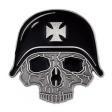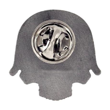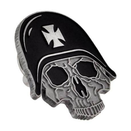 The helmet with an iron cross is worn nowadays by bikers...it gives off a rough and tough look while riding! Our Biker Skull with Helmet Pin is worn best on your leather vest or saddlebag by true rebel renegades. It is designed with a longer (10mm) post to go through your thicker gear. Die struck from fine jeweler's metal; black enamel filled and antique silver plated. It comes with a standard clutch back and is individually poly bagged.