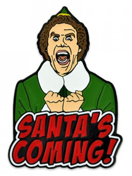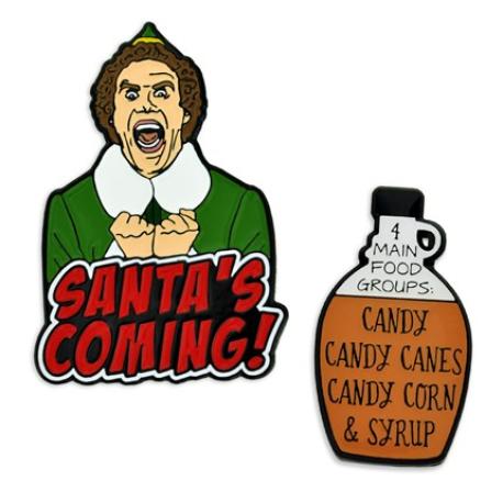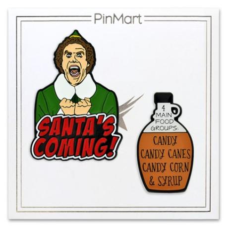 The Santa's Coming 2-Pin Set includes our Candy and Syrup Pin and Santa's Coming Pin. These pins come attached to a white heavy stock card with shiny silver metallic accents for a festive display. Our bundles are a ready-to-give gift set. They come in a sealed poly bag and then nicely placed in an organza drawstring bag. Give your ugly sweater extra frills with this Christmas comedy pin set!