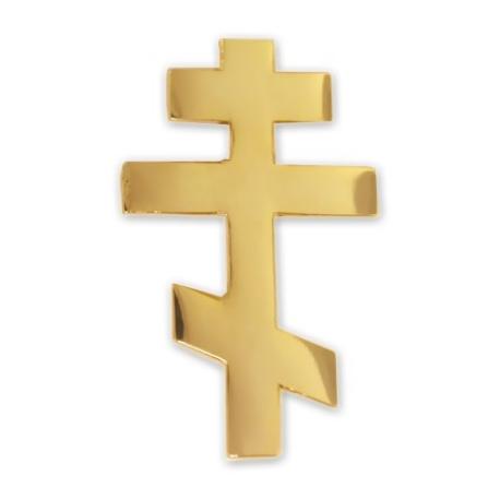 The Eastern Orthodox Cross can be considered a modified version of the Patriarchal cross, having two smaller crossbeams, one at the top and one near the bottom, in addition to the longer crossbeam. The lower crossbeam represents the footrest to which the feet of Jesus was nailed. A simple gold rendition, this is a perfect pin to wear at service or days of remembrance. This pin is die struck from premium jeweler's metal, gold plated, and polished to a shine. Each pin includes a standard clutch back and is individually poly bagged.